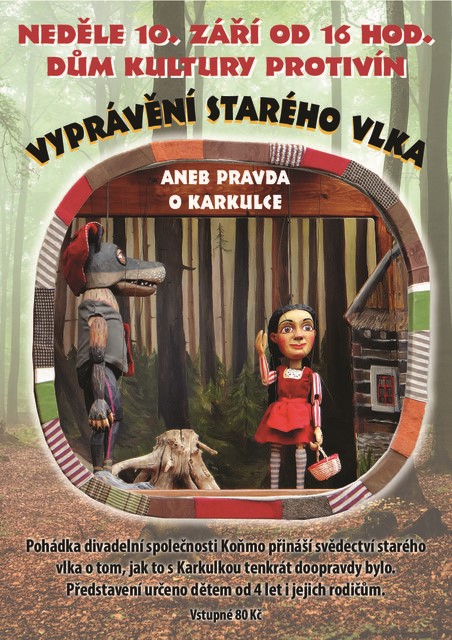Nejnovější pohádka divadelní společnosti Koňmo přináší konečně autentické svědectví starého vlka o tom, jak to s Karkulkou tenkrát doopravdy bylo. Představení kombinující hru s marionetami, činohru a živě provedené písně je určeno dětem od 4 let i jejich rodičům.
